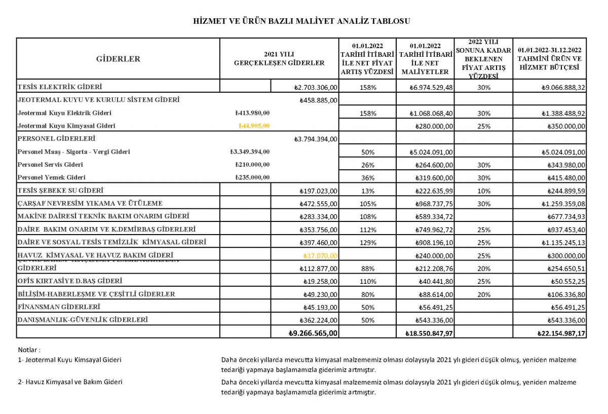 Aralık ayının son haftasında 2022 yılı içerisinde elektrikteki toplam fiyat artışının %70 olacağı tahmini ile geçici olarak bir aidat belirlemesi yapmıştık. Fakat 01.01.2022 tarihinde bir gecede elektrik fiyatı %128 artmış, maliyetlerimizi taşınamaz hale getirmiştir. Termal suyun çıkarılmasından dairelere taşınmasına, ısınma ihtiyacımızdan ortak alanların aydınlatılmasına, havuzlar bölgesi iklimlendirilmesinden havuzların dezenfektasyonuna kadar her alanda elektrik kullanmaktayız. Aynı anda büyük tüketimli onlarca pompa ve motor çalışmaktadır. Üyelerimizden toplanan elektrik depozitoları sadece dairelerinin aydınlatılması ve daire içerisinde kullandıkları elektrikli cihazların tüketimi içindir.