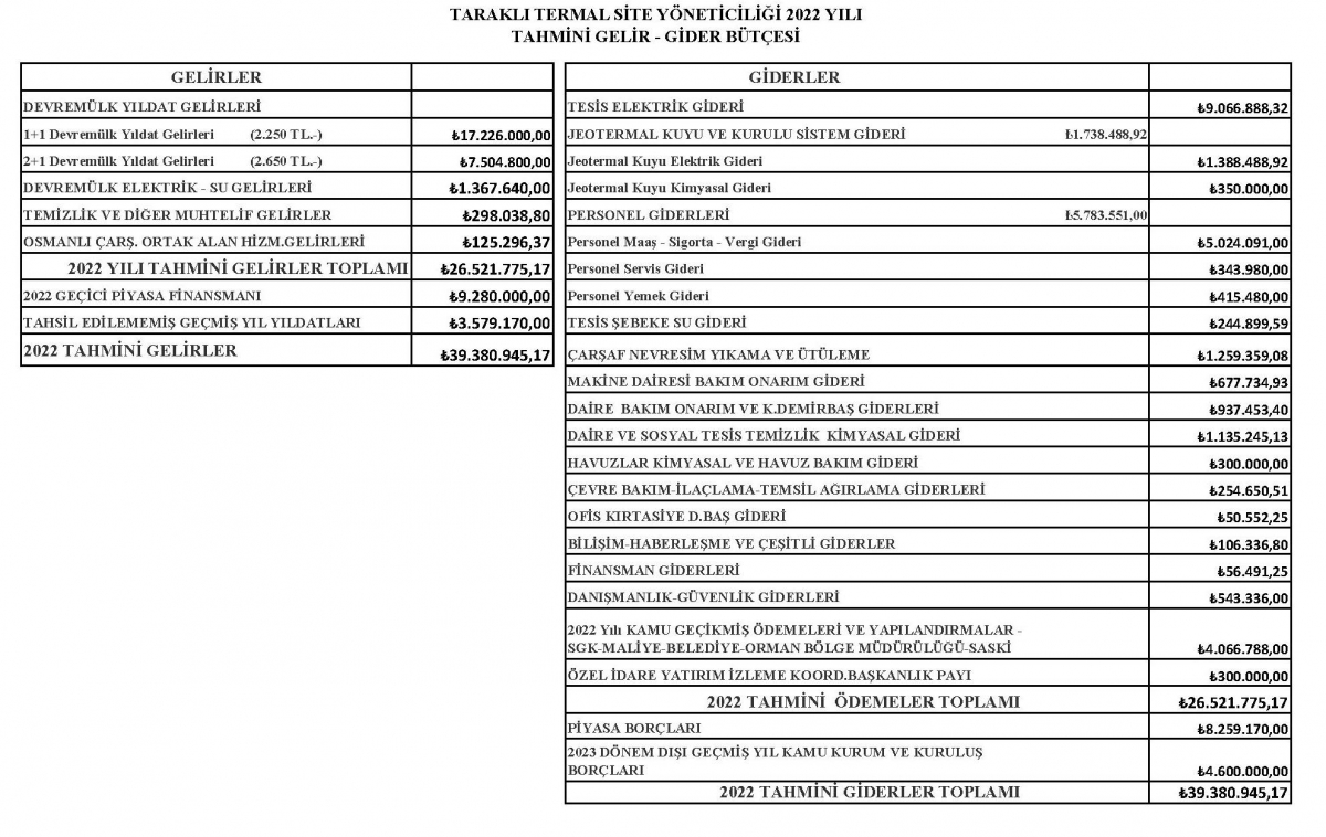 Taraklı Termal Site Yöneticiliği 2022 yılı gerçekleşmiş gelir-gider tablosu ve 2023 yılı tahmini gelir-gider tablosu