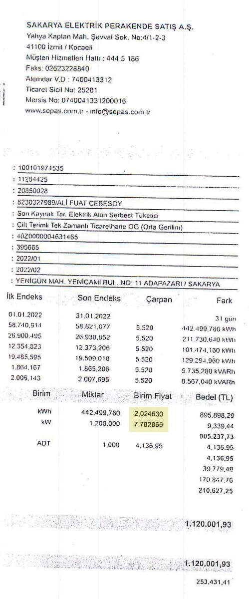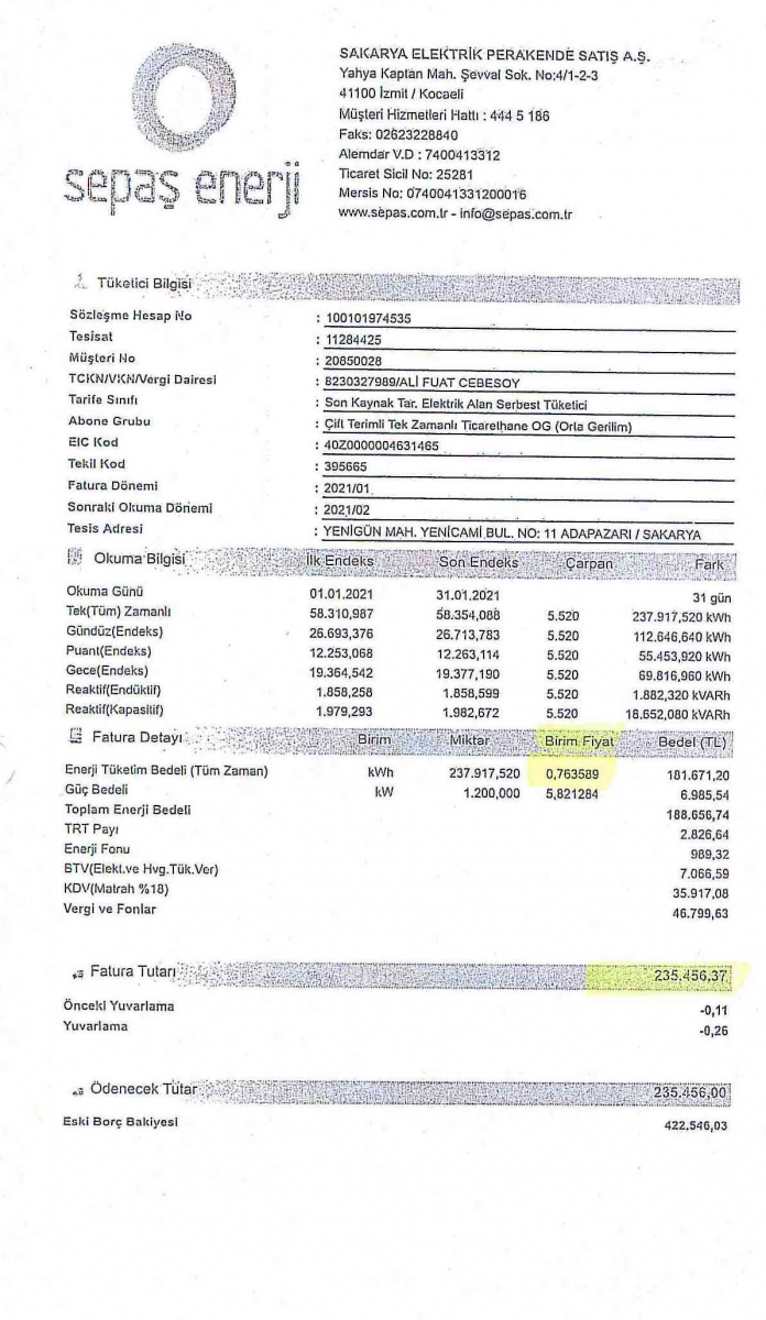 2021-2022 Ocak Ayı Örnek Faturalar ve Birim Fiyat Karşılaştırmaları
